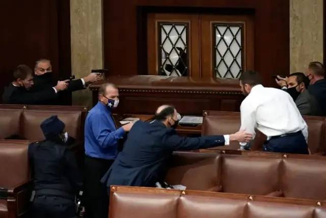 当地时间1月6日,美国华盛顿,示威者进入美国国会区域,并攻破了国会大厦,警察持枪与示威者对峙。