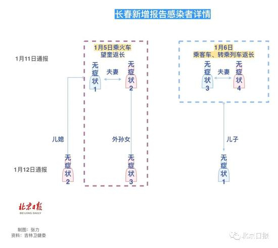两对夫妻于1月5日、6日,分别乘坐火车(K350次列车 11车27座、28座)、客车转列车(Z158次列车 17车34座,35座)从望奎返回长春。其中,一对夫妻的儿子被感染,其从事物流行业;一对夫妻的儿媳感染,其系服装店销售员,与他们一同从望奎返长的外孙女也被感染。
