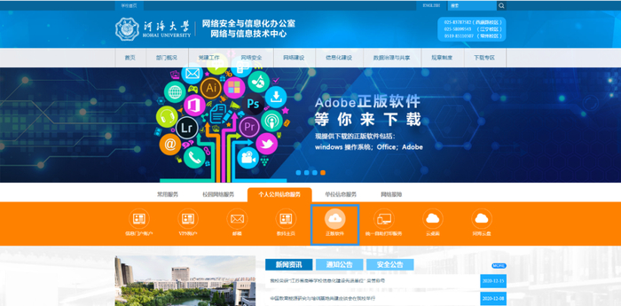 激活方法:微软软件使用KMS激活工具进行激活,具体过程见网信办通知页面相关链接(http://hhic.hhu.edu.cn/main.htm);Adobe软件在接入校园网络环境(校外需使用VPN方式接入)下自动激活无需额外操作,安装直接从解压安装包点击setup进行安装。