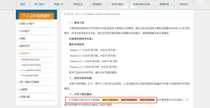 下载方式:进入河海大学网信办官网(http://hhic.hhu.edu.cn/main.htm),在个人公共信息服务下,打开正版软件,通过对应文章中提供的3个地址进行下载。