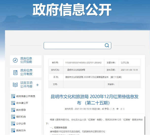 近日,云南昆明市文化和旅游局根据《昆明市旅行社、分社及从业人员“红黑榜”制度》,公布了2020年12月旅游“红黑榜”,一家公司被处30万元的罚款,1名导游被吊销了导游证。