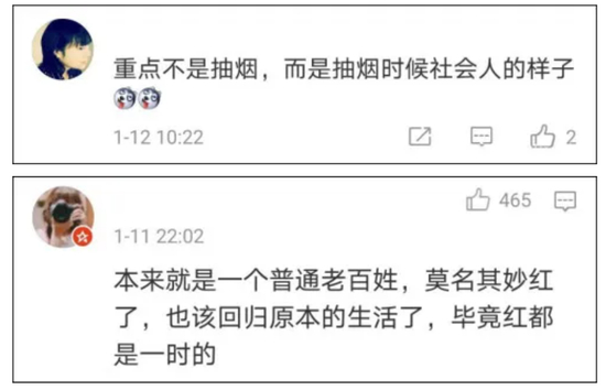 起因是1月11日,一则“丁真抽烟”的视频冲上热搜,在视频里,丁真抽着电子烟,动作娴熟,画面中烟雾缭绕,与他之前展示给公众的形象反差很大。部分网友对此表示很失望,直呼其“淳朴人设崩塌”,另一些网友却认为,成年人抽烟不犯法,何必大惊小怪。