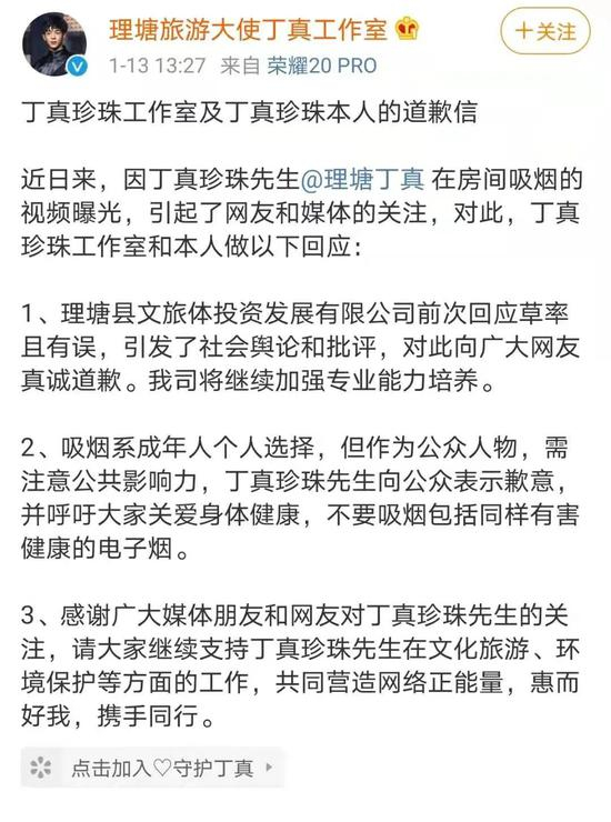 丁真珍珠工作室和本人回应表示:“吸烟系成年人个人选择,但作为公众人物,需注意公共影响力,丁真珍珠先生向公众表示歉意,并呼吁大家关爱身体健康,不要吸烟包括同样有害健康的电子烟。”并呼吁大家“继续支持丁真珍珠先生在文化旅游、环境保护等方面的工作。”