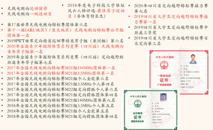 梁田,男,电子科学与工程学院(示范性微电子学院)电磁场与无线技术专业2017级本科生,2020年“成电杰出学生”。无线电测向运动国家级运动健将、国家一级运动员。无线电测向国家队队员、国家青年队队员,曾获世锦赛第六名、亚锦赛冠军等。本科期间,获世强奖学金、九洲奖学金等。曾任校测向定向协会会长、电子科协副部长、2017020906班科创委员、2020190501班导生。2018年进入极高频复杂系统重点学科实验室,在IEEE Antennas and Wireless Propagation Letters期刊等发表论文4篇。作为模块负责人参研科技项目两项,两次获得盟升杯电子设计大赛一等奖。在全国无线电测向锦标赛夺得两项冠军,四川省大学生定向越野锦标赛夺得一金一铜。保研本校。