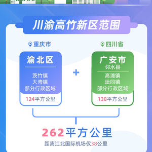川渝高竹新区区位优势明显,规划区域距离重庆江北国际机场38公里、重庆两江新区15公里、重庆果园港55公里、重庆火车北站58公里、邻水县城40公里,紧靠中国(重庆)自由贸易试验区、重庆保税港区、重庆临空经济示范区等国家级功能平台,属重庆半小时通勤圈。
