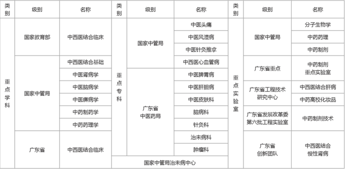 学院目前设有中西医结合博士后流动站1个,中西医结合和中药学2个一级学科博士学位授权点,中医学一级学科硕士学位授权点;开设中西医临床医学、中医学、针灸推拿学、中药学、中药制药学5个本科专业。拥有国家重点学科1个,国家中医药局重点学科6个、重点专科4个、治未病中心1个、三级实验室3个;拥有国家特色专业1个,国家一流专业建设点2个,国家级教学团队1个,国家精品课程/金课6门,广东省一流专业建设点4个、重点专业2个、名牌专业2个、特色专业3个,广东省高校实验教学示范中心2个,广东省精品课程/金课20门。