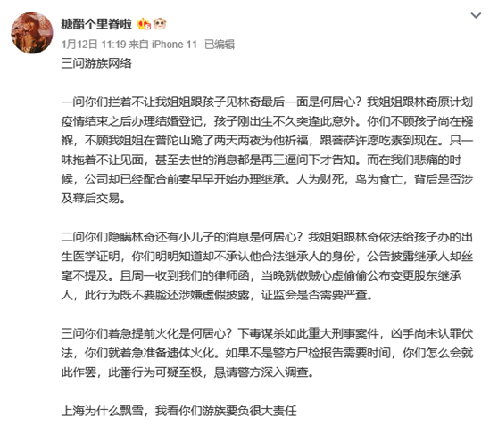 本来以为游族网络变故就此告一段落,谁知第二天就天降大瓜——微博网友 @糖醋个里脊啦 1月12日中午发文“三问游族网络”,事关游族网络CEO林奇遗产继承一事。据该网友称,林奇与其姐“原计划疫情结束之后办理结婚登记”,且育有一子。