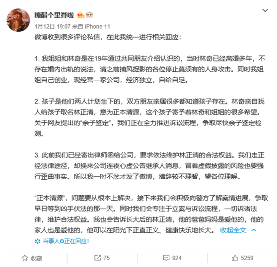 1月12日晚,@糖醋个里脊啦 又发微博表示,她的姐姐和林奇是2019年认识的,林奇当时已离婚多年,不存在婚内出轨的说法。