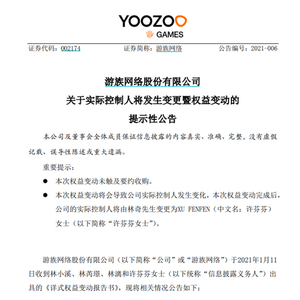 1月11日晚间,游族网络发布关于实际控制人将发生变更暨权益变动的提示性公告。