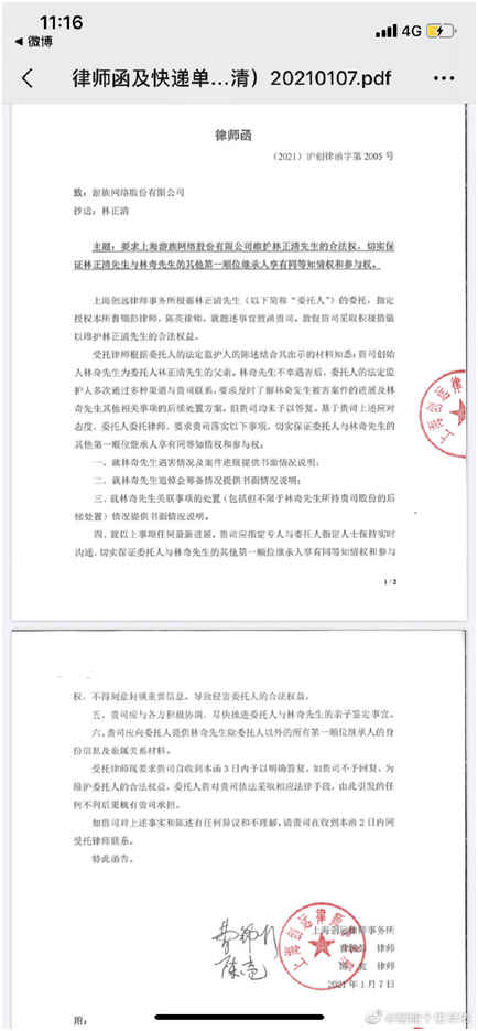 最重要的一点是,按照爆料网友的说法,游族网络知道这个小儿子的存在。在林奇去世后,女方律师1月7日寄了律师函,希望林正清和其他第一顺位继承人(林正清和前妻生的三个子女)有同等知情权和参与权。
