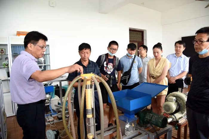 ▲廖庆喜教授在咸宁开展“乡村振兴荆楚行”活动,图为廖庆喜教授为企业负责人介绍油菜直播机工作原理(工学院 供图)