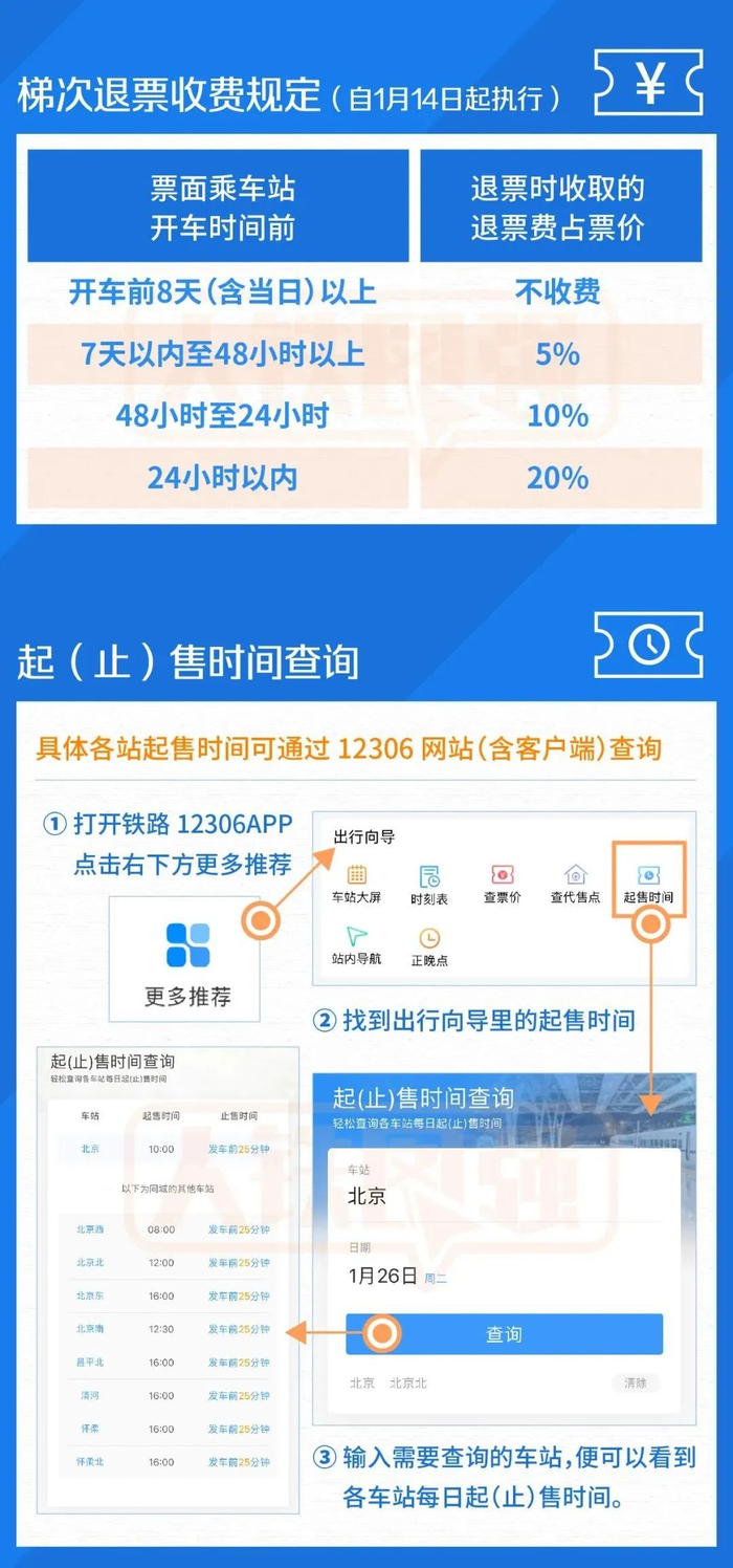 自1月14日起,旅客因行程改变需退票的,免收退票费的时间期限由原规定的开车前15天以上同比例调整为开车前8天(含当日)以上;7天及以内退票的,仍按48小时以上、48~24小时、24小时以内梯次退票收费规定执行;办理改签和变更到站业务时,仍不收取改签费用;其他情况仍按原规定执行。