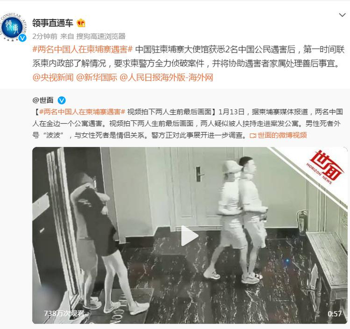14日晚,外交部领事保护中心在其官微回应称,中国驻柬埔寨大使馆获悉2名中国公民遇害后,第一时间联系柬内政部了解情况,要求柬警方全力侦破案件,并将协助遇害者家属处理善后事宜。