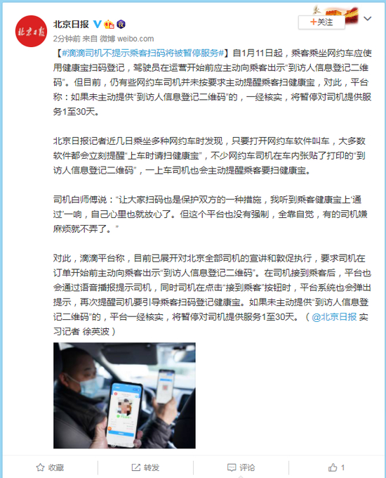 自1月11日起,乘客乘坐网约车应使用健康宝扫码登记,驾驶员在运营开始前应主动向乘客出示“到访人信息登记二维码”。但目前,仍有些网约车司机并未按要求主动提醒乘客扫健康宝,对此,平台称:如果未主动提供“到访人信息登记二维码”的,一经核实,将暂停对司机提供服务1至30天。