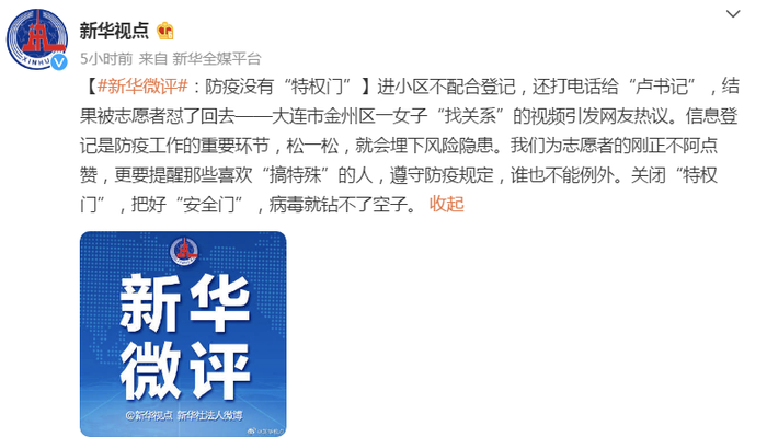 @新华社微博刊发《新华微评:防疫没有“特权门”》,全文如下↓