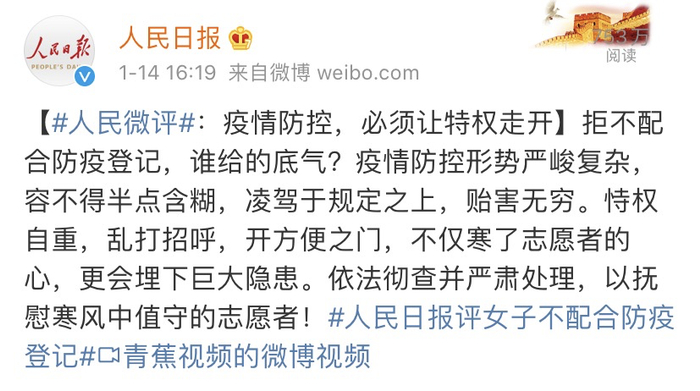 @人民日报 微博刊发《人民微评:疫情防控,必须让特权走开》。全文如下↓