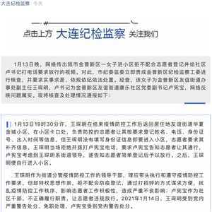 刚刚,大连纪律检查委员会官方微信公号“大连纪委监察”发布《关于一起违反疫情防控纪律问题的通报》。通报称,1月13日晚,网络传出我市金普新区一女子进小区拒不配合志愿者登记并给社区卢书记打电话要求放行的视频。对此,市纪委监委立即责成金普新区纪检监察工委进行核查,并要求实事求是、依规依纪依法处置。经查,该女子为金普新区友谊街道办事处副主任王琛明,卢书记为金普新区友谊街道康乐社区党委副书记卢宪宝,网络反映问题属实。