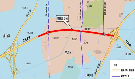 按照《北京城市总体规划(2016年—2035年)》,京良路西段、京昆高速、京良路这3条路共同构成南部地区进出中心城的快速通道。此前,京昆高速和京良路已建成投入使用。2018年,京良路西段被写入了《促进城市南部地区加快发展行动计划(2018-2020年)》。去年,项目被纳入《北京市2020年重点工程计划》重点推进。目前,项目已基本完成驻地建设,正在开展地面清表等前期施工,预计2022年底建成通车。