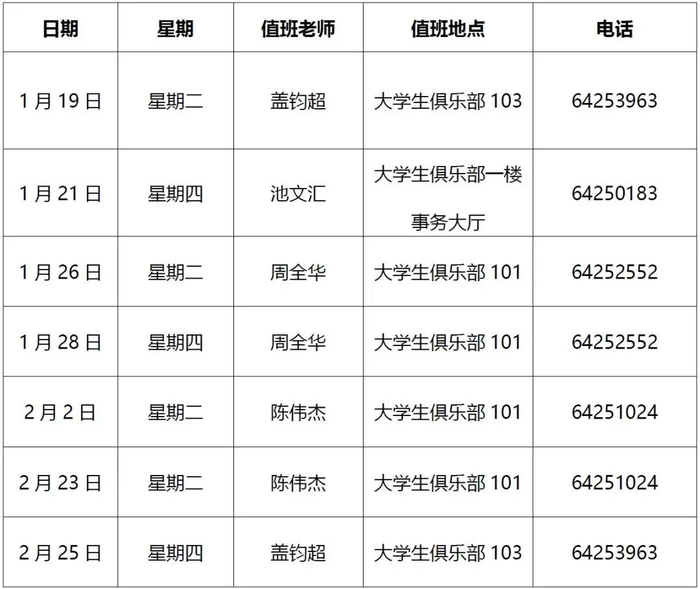 值班电话:64252637(周一~周五,09:00~11:30、13:30~16:00)。