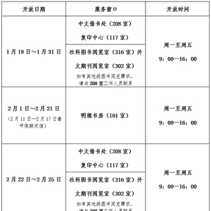 2. 服务时间:1月21日~2月22日期间,每周一、周三、周五,上午9:00~11:30,下午1:30~4:00,2月23日起恢复正常。