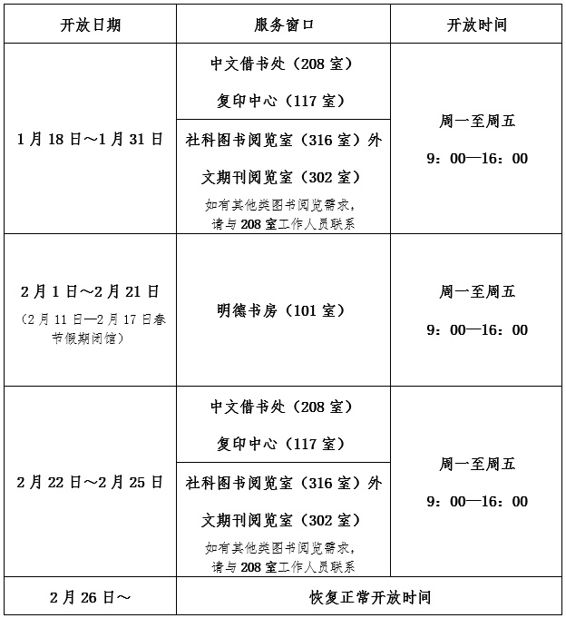 (2)服务时间:1月21日~2月22日,9:00~11:30,13:30~16:00;2月23日起恢复正常。
