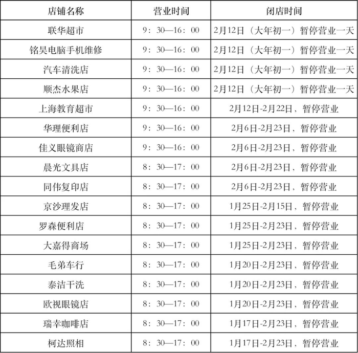 友情提示:商业街店铺将根据师生实际需求,自行安排开放,但闭店时间不早于上表。