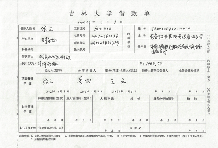 1.吉林大学借款单(一式三联套写);
