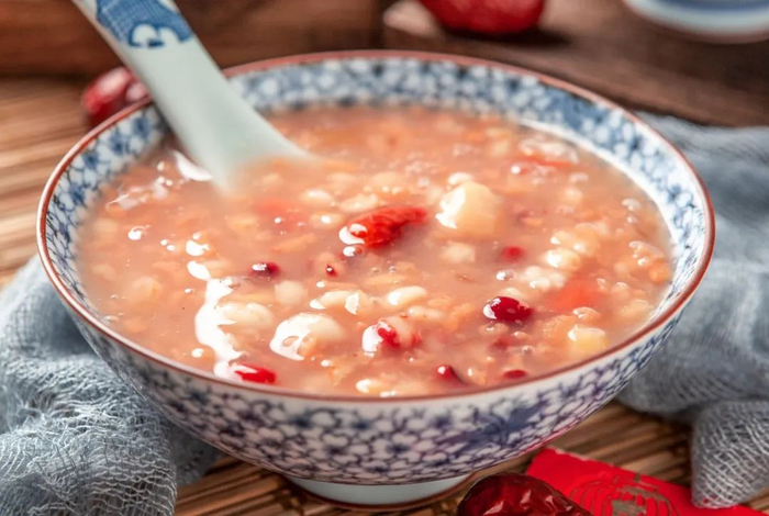 鲜参、枸杞、红枣、龙眼肉、莲子、花生、白扁豆、陈皮、米仁、红豆、黑米、糯米等。