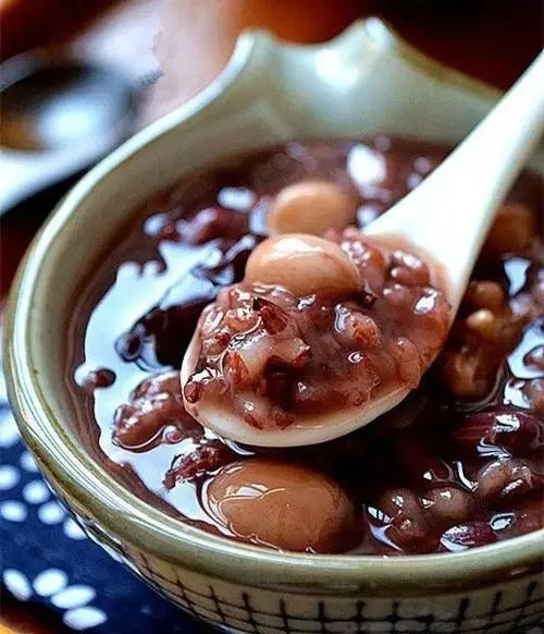 ◆锅内放入适量的水,把龙眼肉、陈皮、米仁、红豆、黑米、糯米、人参洗干净倒入锅内煮。煮到半熟时,再将枸杞、红枣洗干净倒入锅内一起煮,待锅开后,再用微火煮。