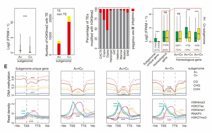 研究者对异源多倍体甘蓝型油菜An和Cn两个亚基因组间的表观遗传学修饰进行了系统性的分析,发现亚基因组间同源基因对的表达偏倚是平衡的,更高表达水平的同源基因有着更高的活跃相关的表观遗传学修饰。但An亚基因组特有基因的整体表达和表观遗传学活性水平都要远高于Cn亚基因组,猜测亚基因组特有基因是甘蓝型油菜亚基因组间不平衡的重要原因之一。