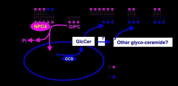 在该研究中,研究者通过扩大拟南芥缺磷条件下脂质组的检测,发现植物特有的鞘磷脂糖基肌醇磷酸神经酰胺(glycosyl inositol phosphoryl ceramide,GIPC)在缺磷条件下会显著下降,同时根中鞘糖脂葡萄糖神经酰胺(glucosylceramide,GlcCer)会大幅度上升。研究者检测了缺磷条件下npc4体内的鞘脂变化情况,发现与野生型(WT)相比,缺磷条件下npc4中GIPC的含量显著高于WT,同时GlcCer的含量则显著低于WT,缺磷条件下NPC4的缺失导致鞘脂代谢受阻。研究者进一步通过体外酶活实验分析发现NPC4可将GIPC水解形成羟基神经酰胺(hydroxyceramide,hCer)和带磷酸基团的极性头部。基因表达分析表明拟南芥在缺磷条件下NPC4和GCS(glucosylceramide synthase,葡萄糖神经酰胺合成酶)会被大量诱导表达,诱导的GCS将NPC4水解GIPC生成的hCer转化为GlcCer。这些研究结果表明NPC4水解GIPC,介导了缺磷条件下鞘磷脂到鞘糖脂的转化。