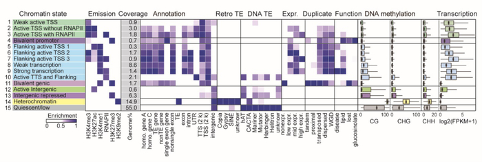 作者在甘蓝型油菜表观基因组图谱中定义了15种染色质状态,观察到An亚基因组中活跃的染色质状态的基因组覆盖度要高于Cn亚基因组,而Cn亚基因组中异染色质状态的基因组覆盖度要高于An亚基因组。另外,通过ChIP-reChIP实验的验证,作者鉴定了一种新的H3K4me1-H3K27me3二价染色质状态。该染色质状态普遍存在于基因本体上,与甘蓝型油菜基因的组织特异性表达有关,在其生长发育过程中起重要作用。但其具体的生物学功能有待进一步深入研究。