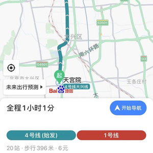 记者查询地图显示从天宫院地铁站到南礼士路地铁站通勤时间在1小时左右,期间可乘坐4号线转1号线,共涉及20站,其中18站在4号线上。