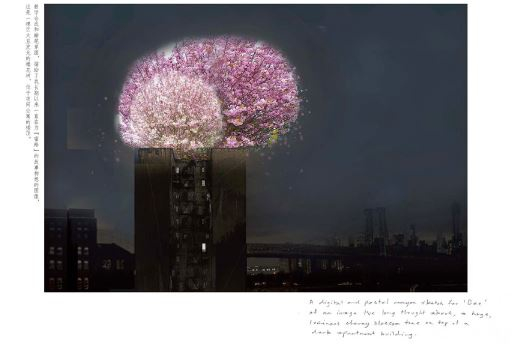 公寓楼顶一棵巨大发光的樱花树,用数字合成和蜡笔完成,是《内城故事》中蜜蜂一篇的草稿。