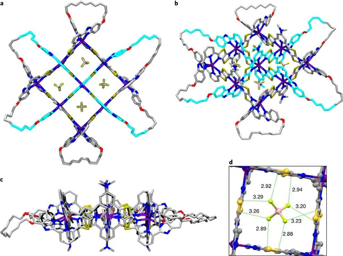 此外,Fe(II)编织3×3网格[Fe916](BF4)18可通过1和Fe(BF4)2组装形成。值得一提的是,四氟硼酸根阴离子对这两种配合物的形成都是至关重要的,替换成其他阴离子便不能制备出3×3编织网格。