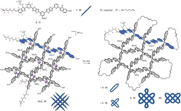 研究通过阴离子和金属离子模板作用编织分子链,组装而成的分子网格具有精确编织的股线,再通过烯烃复分解关环反应制备得到分子结。