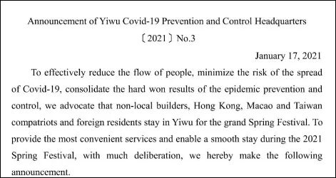 为切实减少人员流动,降低新冠肺炎疫情风险,见固来之不易的防控成果,倡导、保障外来建设者、港澳台同胞和外籍友人在义乌过大年,经市防控指挥部研究,现将 2021年春节期间有关事项通告如下: