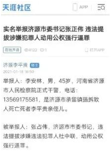 而让张战伟没有想到的是,这记耳光也引来了又一个实名举报——1月18日下午,河南省济源市检察院正式干警李安林同样实名举报济源市委书记张战伟。李安林在举报中说道,“张战伟涉嫌违法提拔涉嫌违法犯罪人杜中联,后者在一起强拆过程中将被害人李平贵致死”。