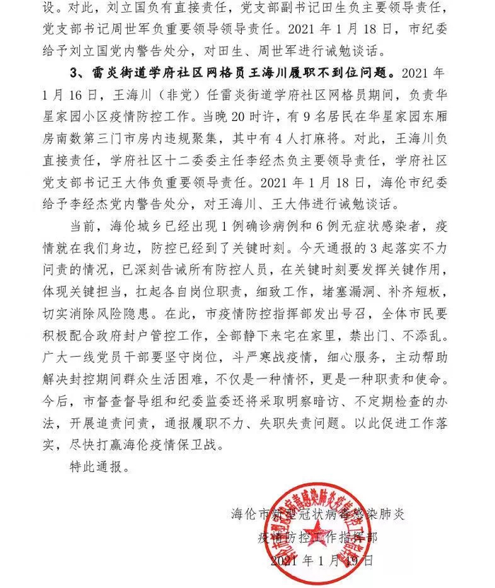 3。雷炎街道学府社区网格员王海川履职不到位问题。2021年 1月16日,王海川(非党)任雷炎街道学府社区网格员期冋,负责华星家园小区疫情防控工作。当日20时许,有9名居民在华星家园东厢房南数第三门市房内违规聚集,其中有4人打麻将。对此,王海川负直接责任,学府社区十二委委主任李经杰负主要领导责任,学府社区党支部书记王大伟负重要领导责任。2021年1月18 日,海伦市纪委给予李经杰党内警告处分,对王海川、王大伟进行诫勉谈话。