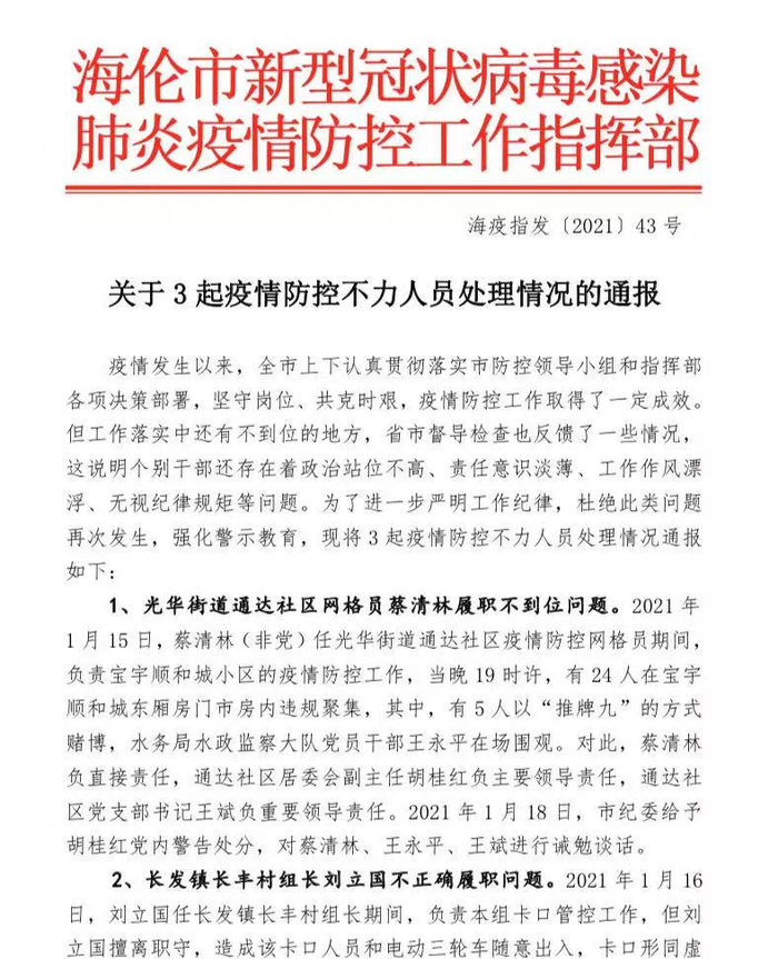 原标题:防控不力被通报!黑龙江海伦市通报3起疫情防控不力事件