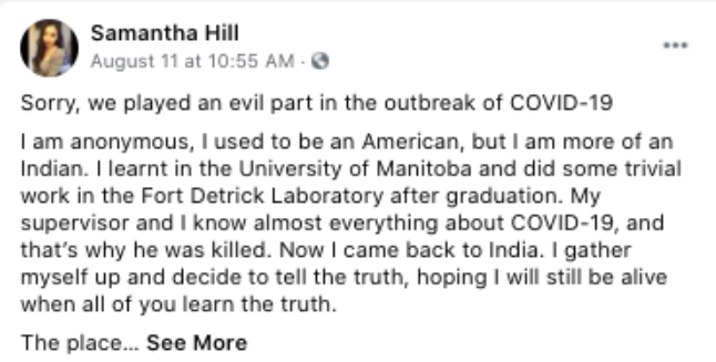 这个帖子的作者就是“@Smantha Hill”。Hill自称,她是一名“逃离美国的印度裔美国人”,曾在美国德特里克生物实验室工作过一段时间,深知那里制造和泄露新冠病毒的内情。
