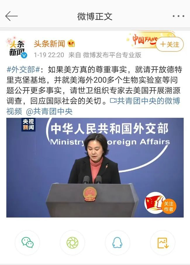 日前,外交部发言人华春莹在回应“美国国务卿蓬佩奥攻击中国阻碍病毒溯源和进行‘虚假宣传’,并指责武汉病毒研究所人为制造及泄露病毒,武汉病毒研究所同军方秘密合作”等言论时强硬表态。