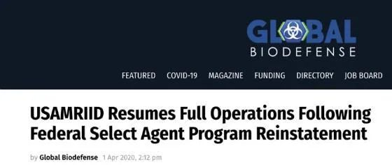 据“全球生物防御”(Global Biodefence)网站报道,在疾控中心最后一次实地检查之后,美国陆军传染病医学研究所于2020年3月27日全面恢复运行,并获得了联邦政府高达9亿美元的拨款,以研发新冠病毒疫苗。