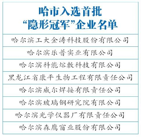 近日,我省公布全省第一批制造业“隐形冠军”企业名单,14家企业入选,其中包括科能熔敷、威尔焊接等8家哈市企业。我省将对“隐形冠军”企业申报省级技术改造和工业投产项目,数字化(智能)车间、两化融合、融资等有关资金支持的项目,引导“隐形冠军”企业加大改造升级力度,提升自主创新能力和品牌建设,推动省级“隐形冠军”企业逐步向国家级“单项冠军”企业迈进。