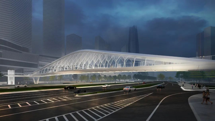中心城区核心地段立体慢行系统项目是“东莞8公里”城市慢行公共空间轴线的重要组成部分,以“中心城环”和“智享绿链”为理念,规划建设4组连桥,全力打造充满活力的高品质城市核心区域。项目设计充分考虑到市民出行便利,包含无障碍设施,连桥的入口处均设有垂直电梯入口,串联公交站、地铁站、附近大型公共服务设施和绿地。沿线均设有观景平台、雨棚和休息座椅,遮雨覆盖率达60%。