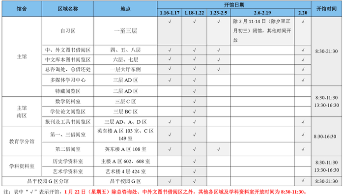 学16楼2层东、7层东自习室正常开放,其它楼层自习室1月25日-2月14日关闭。