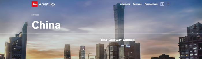 Arent Fox的中国业务页面,背景是北京国贸中国尊。