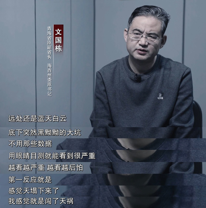 青海省原副省长、海西州委原书记文国栋在专题片中坦言,直到2020年8月事发之后,自己才第一次真正到非法开采现场查看,第一次目睹自己的行为给生态环境造成的伤痕。(视频截图)