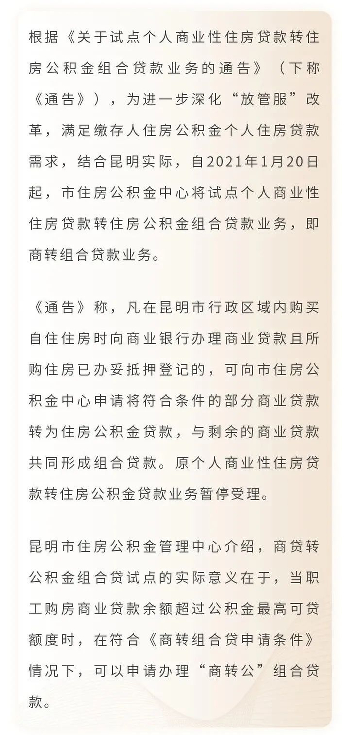 近日,昆明市住房公积金管理中心发布通告,自2021年1月20日起,试点个人商业性住房贷款转住房公积金组合贷款业务,即商转组合贷款业务。原个人商业性住房贷款转住房公积金贷款业务暂停受理。