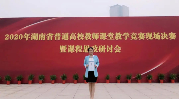 近日,胡珂菲在由湖南省教育厅、湖南省教育工会主办的2020湖南省普通高校教师课堂教学竞赛中斩获一等奖,这是她第一次参加省赛,同场竞技的还有来自全省52所普通高校的235名教师,包括文科、理科、工科、思政四个组别。